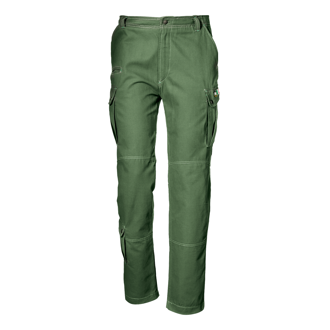 Made of 100% Canvas cotton fabric with soft finishing, 270 g/m², fly with zip and button, two welt pockets, back pockets and side utility pockets with flap and snap button, coin-pocket, patch pocket with flap and snap button closure on the right leg, Italian flag on the left side pocket and double stitched seam in contrast colour.
