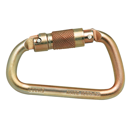 Steel karabiner, 23 mm opening and triple action-locking. Minimum breaking strength: 25 kN.